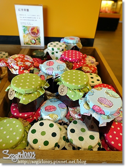 一罐罐玻璃罐包裝的是果醬~瓶蓋用花布包的花花綠綠