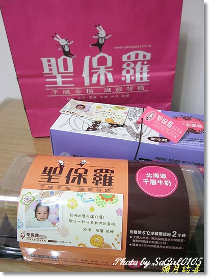 送了兩條聖保羅的蛋糕~盒子上有BABY的照片&新手爸媽的感謝卡